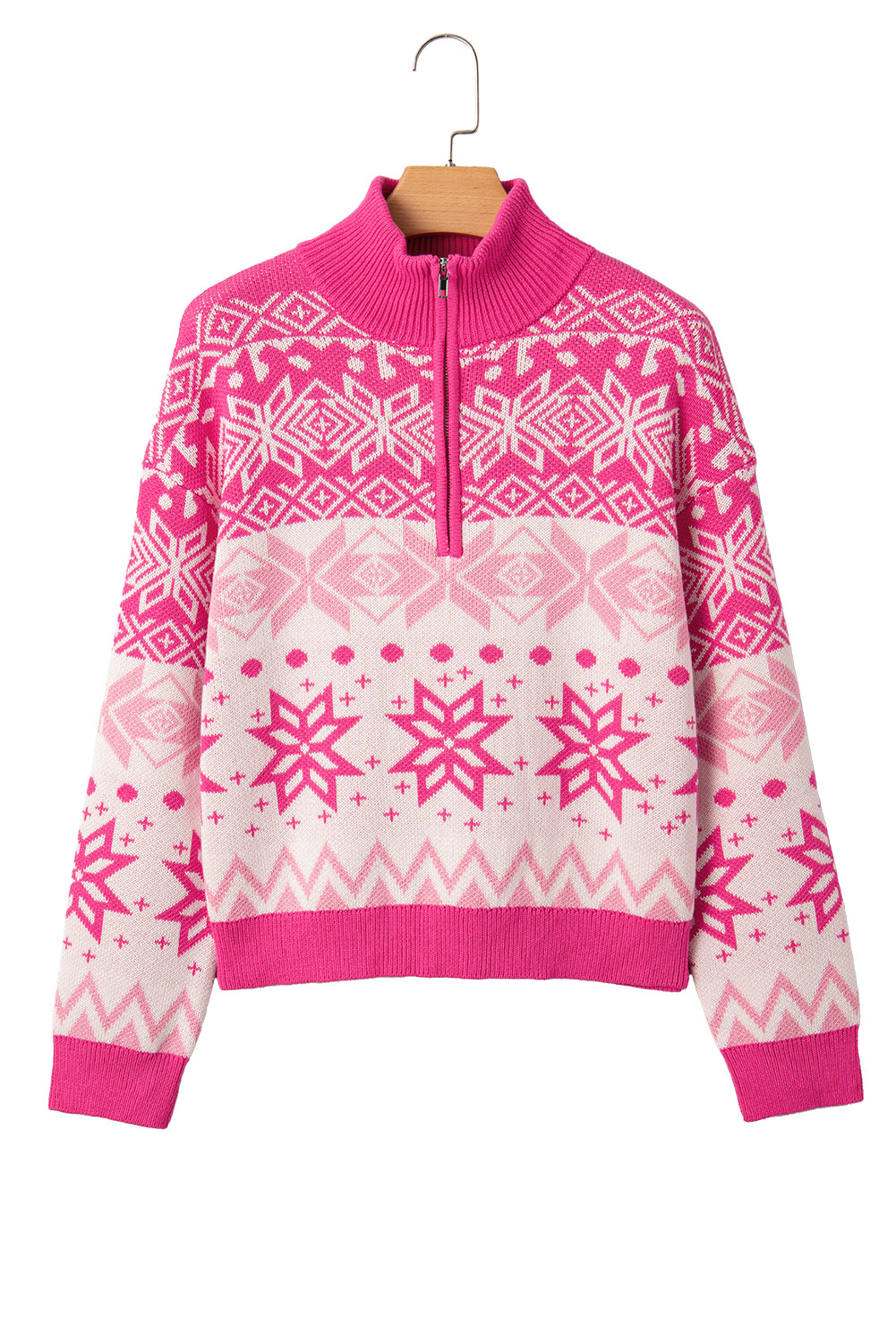 Rose Red Christmas Snowflake Quarter Zip Collard Sweater